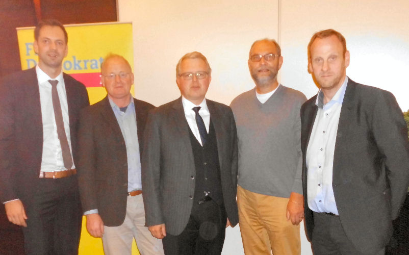 v.l. Mark Lürbke MdL, niederrheinische Europakandidat Dr. Michael Terwiesche, Frank Schäffler MdB, Robert M. Prell Fraktionssprecher Kreistag Höxter, Thomas Hommen, FDP Alpen