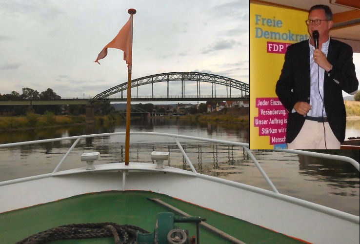 Das Sommerfest des Bezirksverbandes mit dem Kreisverband Minden-Lübbecke fand bei einer Schifffahrt auf der Weser vom Anleger der neuen Schachtschleuse in Minden aus statt. Gast war Bernd Reuther MdB, der in seiner Eigenschaft als Vorsitzender der Arbeitsgruppe Verkehr auch einiges zur Verkehrspolitik in NRW zu berichten wusste. Photo: rmp