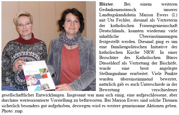 Bei einem weiteren Gedankenaustausch unserer Landtagskandidatin Marion Ewers (l.) mit Uta Fechler, diesmal als Vertreterin der katholischen Frauengemeinschaft Deutschlands, konnten wiederum viele inhaltliche Übereinstimmungen festgestellt werden.