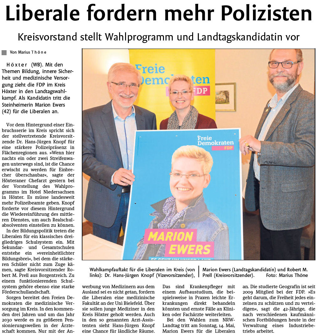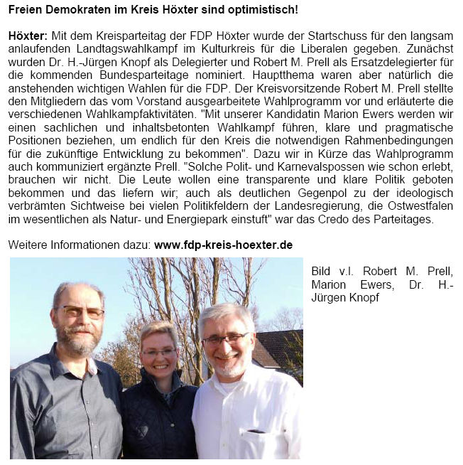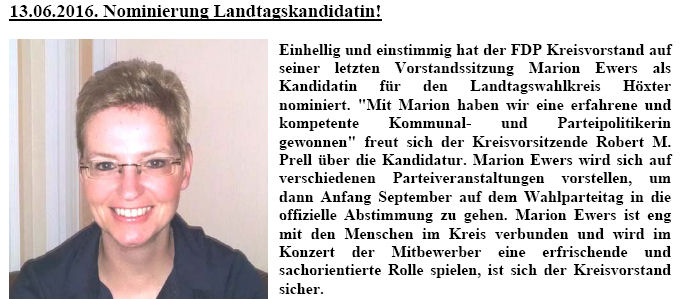 Einstimmig wurde Marion Ewers zur Landtagskandidatin für den Wahlkreis 102 Höxter gewählt. Der geschäftsführende Vorstand wie die gesammte Versammlung freut sich, dass die FDP im Kreis eine so gute Kandidatin präsentieren kann.