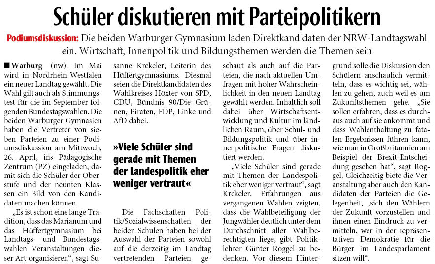 Auf dem Podium im Pädagogischen Zentrum, diesemal vom Hüffertgymnasium und dem Marianum veranstaltet, konnte unsere Landtagskandidatin Marion Ewers ein weiteres Mal die FDP hervorragend vertreten. Mit viele Lob für ihre klare Ansage und die rethorische Ausführung, hob Sie sich deutlich von den Mitbewerbern ab. Photo: rmp.