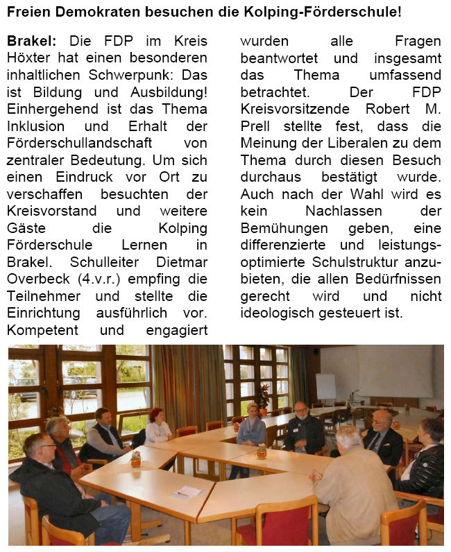 Besuch von Mitgliedern des Kreisverbandes in der Kolping-Förderschule Lernen in Brakel. Dietmar Overbeck, der Leiter der Einrichtung (4.v.r.), stellte sehr kompetent und engagiert die komplexen Anforderungen der Schule vor. Photo: rmp.