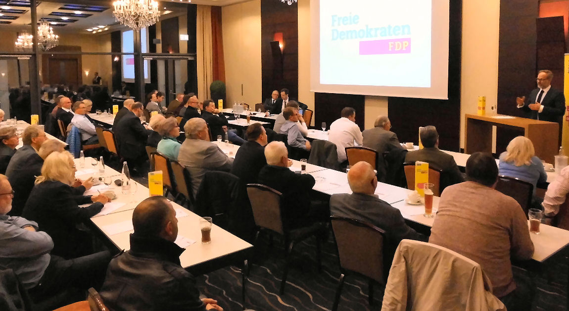 v.l. Mark Lürbke MdL, niederrheinische Europakandidat Dr. Michael Terwiesche, Frank Schäffler MdB, Robert M. Prell Fraktionssprecher Kreistag Höxter, Thomas Hommen, FDP Alpen