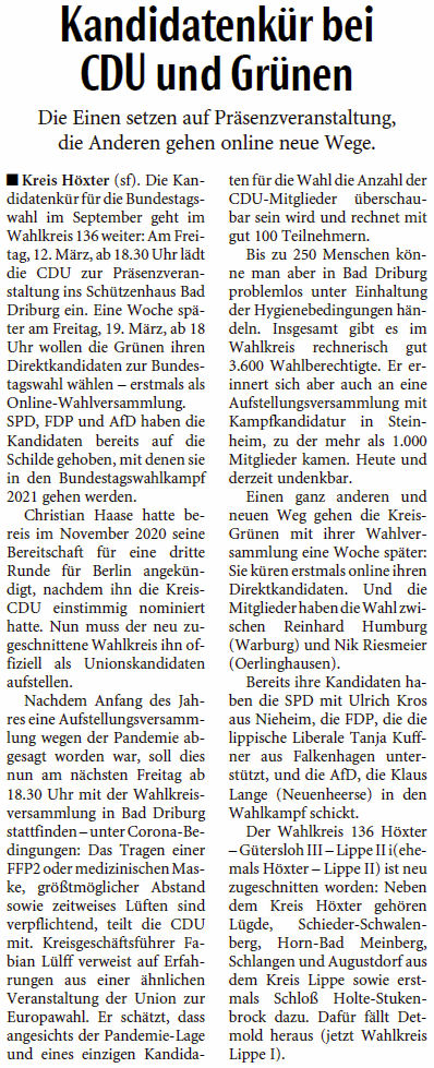 In Bad Salzuflen fand der gemeinsame Wahlparteitag von Höxter und Lippe II statt. Die entsprechenden Mitglieder beider Kreisverbände hatten die Aufgabe, ihren Bundestagskandidaten für den Wahlkreis 136 zu bestimmen. Ohne Gegenstimme wurde Tanja Kuffner einmütig zur gemeinsamen Kandidatin gewählt. Die beiden Kreisvorsitzenden freuten sich über das klare Ergebnis und waren sich einig, dass ein engagierter Wahlkampf in 2021 zu führen sein werde. Photo: Robert M. Prell.