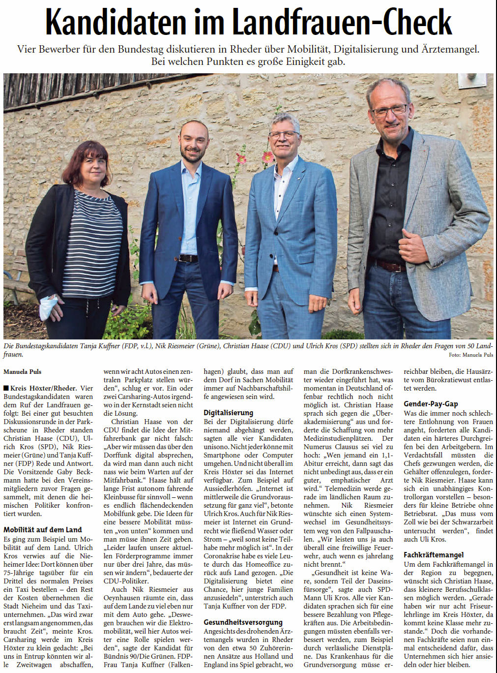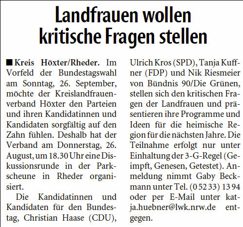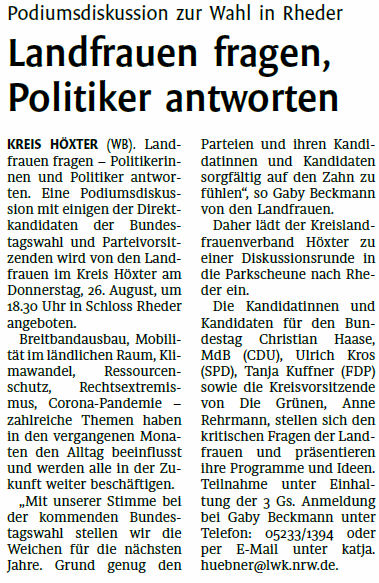 Ins Schloss Rheder lud die Vereinigung der Landfrauen im Kreis Höxter örtliche Bundestagskandidaten zu einer Diskussionsrunde ein. Die verschiedenen Parteiprogramme wurden vorgestellt (CDU, SPD, FDP, Grüne) und die Teilnehmer stellten sich den kritischen Fragen der Landfrauen sowie des Publikums. Bei einigen Themen gab es relativen Konsens der Kandidaten und Kandidatinnen, bei anderen Themen lag man doch weiter auseinander. Die bekannten Schwerpunktthemen der eingeladenen Parteien konnten jedoch gut identifiziert werden. Fotos: Robert M. Prell