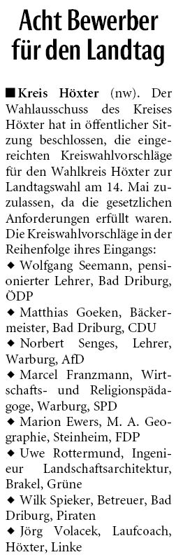 05.09.2016 WB | 06.09.2016 NW | 10.10.2016 FDP | 17.10.2016 WB | 11.11.2016 FDP | 09.02.2017 FDP | 13.02.2017 NW | 06.03.2017 FDP | 23.03.2017 NW | 23.03.2017 WB | 28.03.2017 NW | 01.04.2017 NW | 01.04.2017 WB | 03.04.2017 WB | 11.04.2017 WB | 11.04.2017 WB | 12.04.2017 NW | 25.04.2017 WB | 25.04.2017 NW | 27.04.2017 NW | 27.04.2017 WB | 03.05.2017 WB | 04.05.2017 NW | 08.05.2017 FDP
