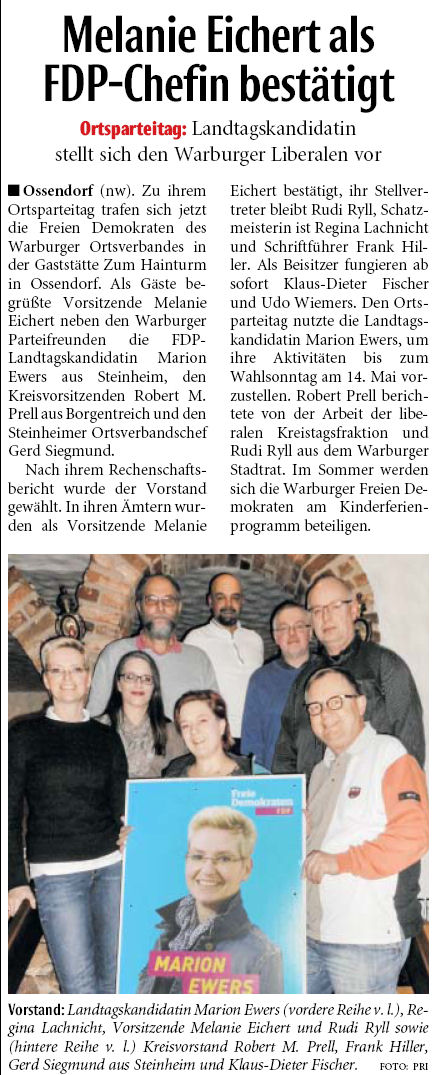 Unsere Landtagskandidatin Marion Ewers leitete die Vorstandswahl des Warburger Ortsverbandes. Der alte/neue Vorstand wurde mit Melanie Eichert als Ortsverbandsvorsitzende wiedergewählt. Der Kreisvorsitzende Robert M. Prell berichtete von den Wahlvorbereitungen.