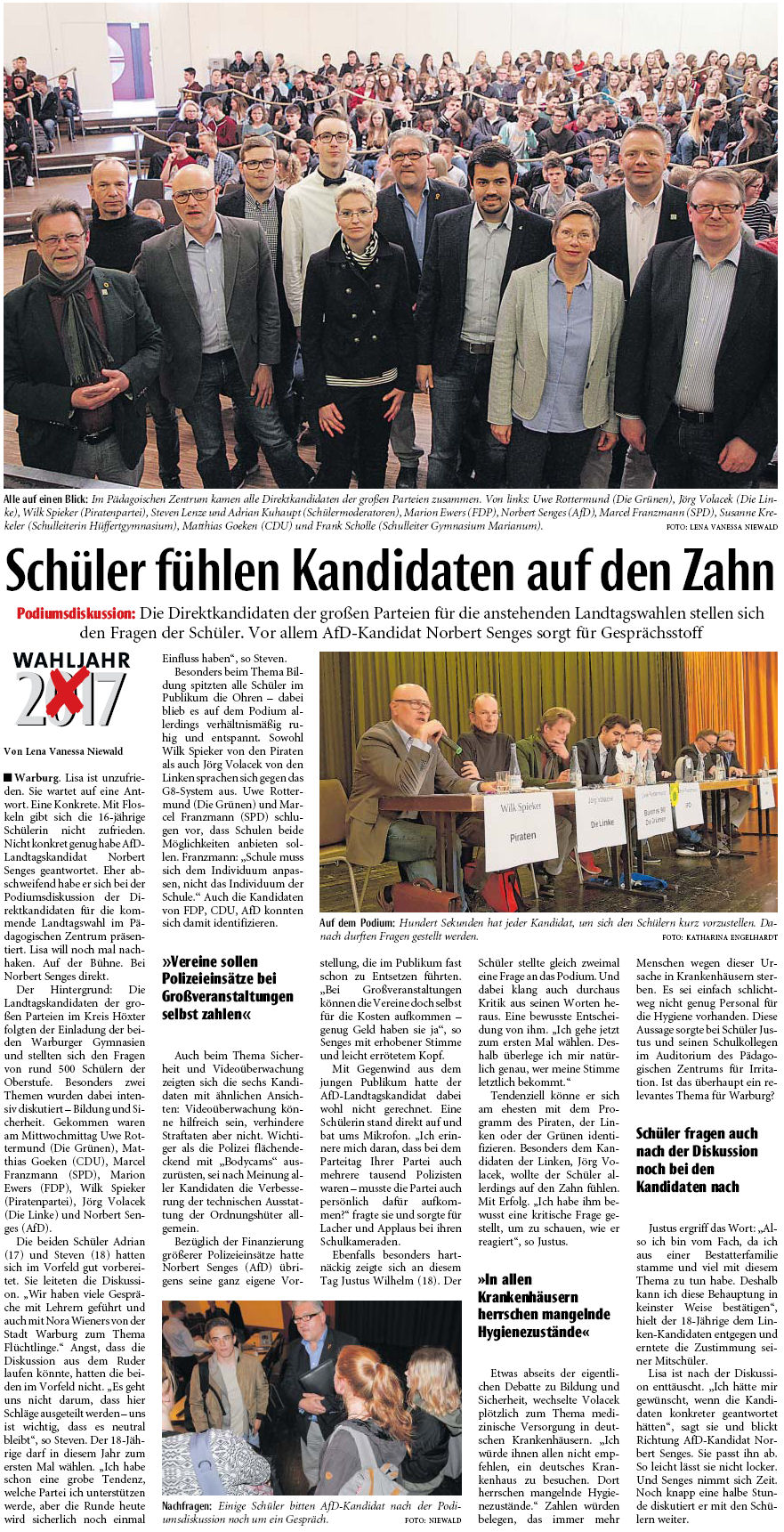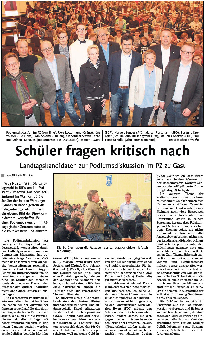 Auf dem Podium im Pädagogischen Zentrum, diesemal vom Hüffertgymnasium und dem Marianum veranstaltet, konnte unsere Landtagskandidatin Marion Ewers ein weiteres Mal die FDP hervorragend vertreten. Mit viele Lob für ihre klare Ansage und die rethorische Ausführung, hob Sie sich deutlich von den Mitbewerbern ab. Photo: rmp.