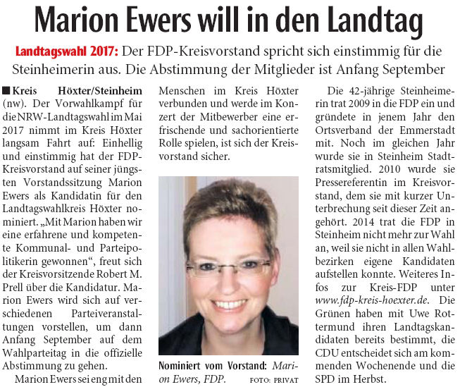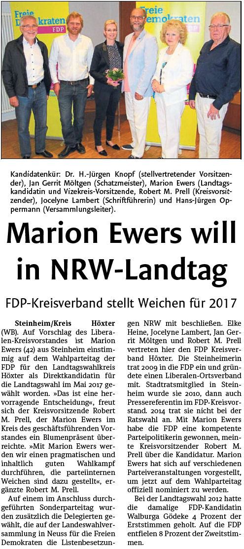 Einstimmig wurde Marion Ewers zur Landtagskandidatin für den Wahlkreis 102 Höxter gewählt. Der geschäftsführende Vorstand wie die gesammte Versammlung freut sich, dass die FDP im Kreis eine so gute Kandidatin präsentieren kann.