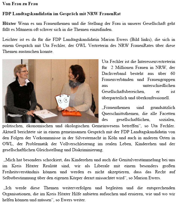 Der NRW FrauenRat, als Dachverband von 60 Frauenverbänden aller gesellschaftlichen Bereiche, vertritt die Interessen von mehr als zwei Millionen Frauen in Nordrhein-Westfalen. "Frauenthemen" sind Querschnittsthemen über alle Facetten des gesellschaftlichen, sozialen, politischen, ökonomischen und ökologischen Gemeinwesens. Die Vorkommnisse in Köln, die aktuelle Diskussion über Vollverschleierung, Kinderehen, aber auch gesellschaftliche Gleichstellung bzw. Diskriminierung sind nur einige Themen, die in der politischen Diskussion Gehör finden müssen.